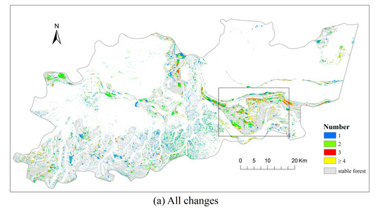 All the forest pixels were extracted by using the ‘anytime’ forest mask, and then the proportion and spatial distribution of stable and changed forests were also analyzed in this section. However, the spatiotemporal characteristic of forest changes must be analyzed to further explain the variation characteristic of forests. Therefore, the number and timing of abrupt changes related to forest, and the variation of forest areas will be discussed in the following sections.