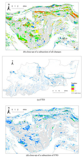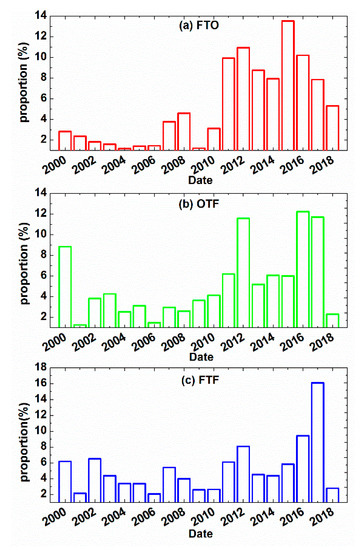 In contrast with the analysis of the timing of last change in Figure 9, the timing of all changes was summarized each year (APK,T, Table 4) to facilitate further comparison (Figure 10). Large parts of FTO occurred since 2011, while a relatively low proportion of FTO was detected before 2011 (Figure 10a). Several clear peaks of OTF were detected during 2000, 2012, 2016, and 2017 (Figure 10b). The frequency distribution of the timing of FTF was relatively even for each year from 2000 to 2018, except for one peak in 2017 (Figure 10c).