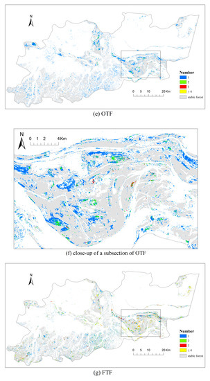 The number (Nc(i), Table 4) and proportion (Pc(i), Table 4) of pixels with single (or multiple) occurrence(s) (iK, Table 4) of abrupt change for each change type were compared to show considerable differences (Table 9). In all the changed pixels related to forest (27.92%), the number of abrupt changes of 25.35% out of 27.92%, which exceeds 90% (25.35%/27.92% = 90.80%) of all the changed pixels related to forest, is from 1 to 3. The number of FTO and OTF, which separately occurred in 13.36% and 11.89% of the forest pixels, is basically 1. The proportion of the forest pixels with FTF is 15.70%. In contrast with FTO and OTF, the proportion of forest pixels with one time FTF (flooded or replantation post-deforestation) is generally equal to that with multiple times FTF. Results indicated that not only the proportion of forest pixels with FTF but also the number of FTF is higher than those of FTO and OTF.