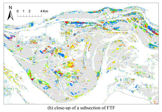 The accuracy assessment results of change detection show higher user accuracy for stable pixels and higher producer accuracy for change pixels (Table 5), indicating more commission errors than omission errors in the detected change pixels. The errors are possibly due to the following reasons: (1) noise; (2) partial change; (3) and influence of classification accuracy. Although the validity of the NSPI, MNSPI and ESTARFM are verified in this study and our previous experiment [44], the noise cannot be removed completely, which is mistakenly detected as change (commission error). The partially changed pixels are difficult to be detected by BFAST due to the insufficiently large spectral change (omission error). The similarity between shoal covered by other vegetation and forest in the spectral characteristics within the Landsat image with 30 m resolution may result in misclassification, and then the inter-conversion between them cannot be identified even if the conversions have been detected by BFAST before classification (omission error).