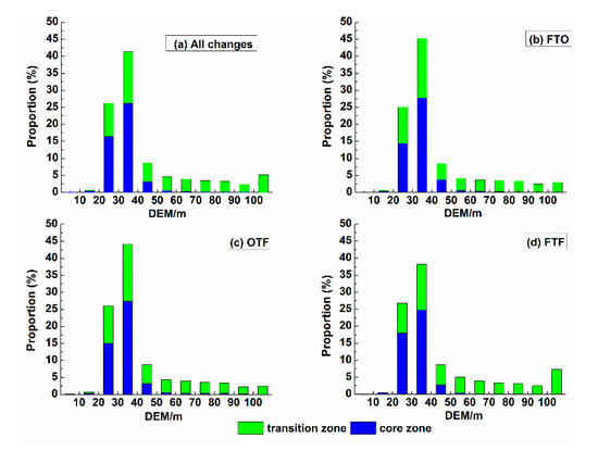 - Not only the proportion of pixels with FTF but also the number of FTF is higher than those of FTO and OTF. The forest change in the core zone is more frequent than that in the transition zone. Most changes occurred in the areas with DEM ranging from 20 to 40 m, in which the proportion of detected change number in the core zone is higher than that in the transition zone regardless of the change type.