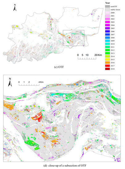 - Large parts of FTO occurred since 2011 due to the policy for protecting wetlands and restoring ecology. Some clear peaks of OTF were detected during 2000, 2012, 2016, and 2017 because of the jumping price of timber. FTF was relatively even for each year, except for one peak in 2017.
