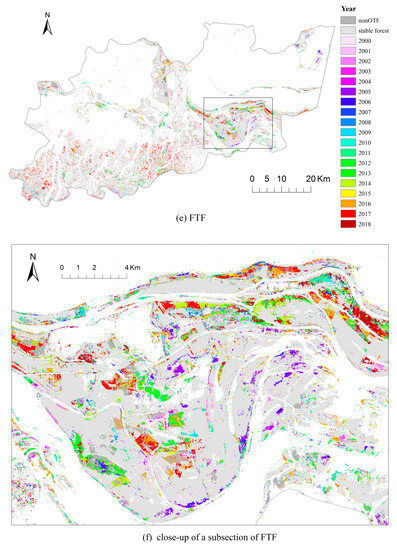 Spatial distribution of the timing (Tl) of last change of different forest change types and their close up of the subsection detected from monthly NDVI time-series: (a,b) conversion from forest to other land cover categories (FTO), (c,d) conversion from other land cover categories to forest (OTF), and (e,f) conversion from forest to forest (FTF, such as flooding and replantation post-deforestation). The changed forest pixels with nonFTO (or nonOTF, or nonFTF) represent that no FTO (or OTF, FTF) occurred in these changed pixels.