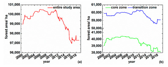 Variation of forest areas (AL,t) between 2000 and 2018 for (a) entire study area and (b) core and transition zones.