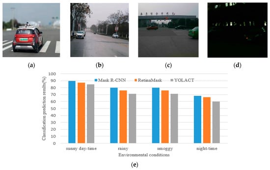 Examples of complex environmental conditions: (a) sunny day-time (high illumination and great visibility); (b) rainy (low illumination); (c) smoggy (bad visibility); (d) night-time (low illumination and bad visibility); and (e) the average precision of classification prediction of Mask R-CNN, Retina-Mask, and YOLACT under different environmental conditions.