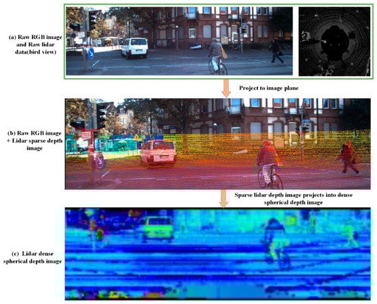 The obtained 3D LIDAR point clouds can be projected onto the 2D image plane, such that they can be processed by the convolutional layer to obtain the feature information of the LIDAR data. In this work, a spherical map is obtained by projecting each 3D point onto a sphere, characterized by azimuth and zenith angles. It has the advantages of representing each 3D point in a dense and compact way, making it suitable for feature extraction. Figure 2a shows an example of an RGB image and a sparse LIDAR point cloud (bird’s-eye view) from the KITTI dataset.