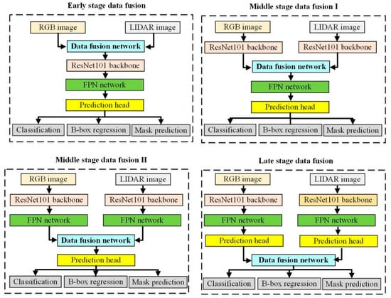 From Figure 3, we can see that the entire network has four basic sub-networks, which are a feature extraction sub-network, a data fusion sub-network, a classification sub-network, and a mask prediction sub-network. The inputs of the network model are RGB–LIDAR image pairs and the outputs are classification results with confidence, b-box localization, and mask proposals.