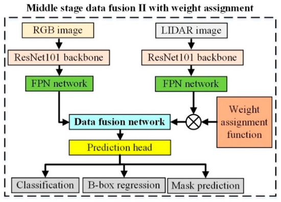 The feature information of multi-sensor data extracted by deep convolutional neural networks can be fused using early-, middle-, and late-stage data fusion methods, as shown in Figure 4. Each fusion strategy has its own advantages and disadvantages []. Early-stage fusion refers to the fusion of raw or pre-processed data. However, neural network models trained in this way lack scalability; this means that, when the data category of the input channel changed, the model needs to be completely retrained. Late-stage fusion has a high degree of flexibility and scalability. However, this fusion method discards a large amount of feature information of the original and intermediate data, which may have a large impact on the final result of the entire network. Middle-stage data fusion makes full use of the advantages of early- and late-stage data fusion methods and, to some extent, circumvents the shortcomings of these two methods. In general, the lower convolutional layers contain more visual details, while higher convolutional layers contain more semantic information. Liu Y et al. [] and Chen X et al. [] designed several different convolutional network fusion architectures by integrating two-branch convolutional networks at different deep neural network stages. Their experiments showed that the middle stage with middle-level convolutional features had the best detection performance. This paper adopts the strategy of middle stage data fusion method. Furthermore, two middle stage data fusion strategies are considered to the fused camera and LIDAR data in our work. The features extracted by ResNet101 networks and FPN networks are fused, respectively, which is the main difference between these two data fusion strategies. The second middle stage data fusion strategy has better detection performance, according to the comparison of the experimental results in Section 4. Therefore, we adopt the weight assignment mechanism on the second middle stage data fusion model.