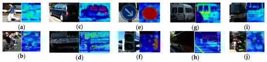 RGB–LIDAR image pair examples in training and validation datasets: (a) pedestrian; (b) cyclist; (c) cars; (d) truck; (e) traffic sign; (f) traffic light; (g) van; (h) bus; (i) train; and (j) motorcyclist.