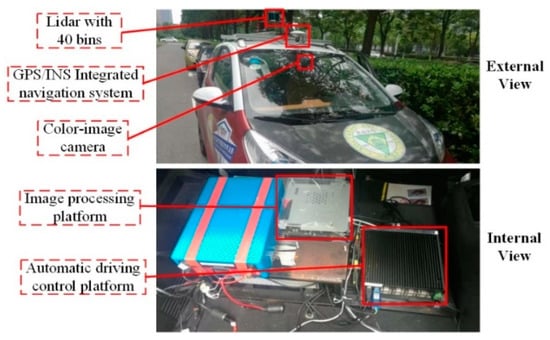The images in the KITTI dataset were basically obtained under clear weather conditions. Therefore, in order to verify the detection performance of the proposed method under complex conditions (e.g., low illumination), we collected and annotated our own dataset, which we named the dual-modal Zhi-Shan dataset. The autonomous vehicle Zhi-Shan, which was designed and developed by Southeast University, was used for camera and LIDAR data collection. The overall appearance and sensing system installation distribution of the autonomous vehicle are shown in Figure 7.