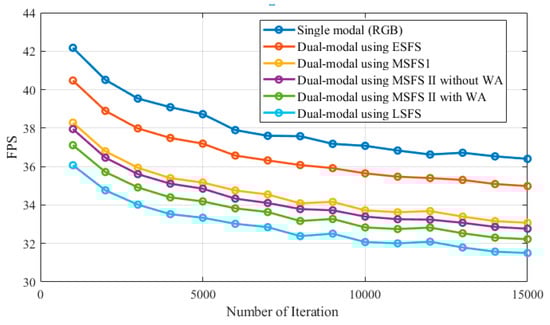 The processing time is a critical metric for autonomous vehicles. When the network cannot handle information in real-time, delays will accumulate and affect the whole autonomous driving system. Losing any key frame may influence subsequent control decisions, regardless of the object being a pedestrian or a car. We trained the whole network with 15,000 iterations and saved the trained model after every 1000 iterations. We randomly selected 1500 images from the validation image dataset to test the processing time performance. The frames per second (FPS) of the proposed network under different iterations considerably changed, reaching approximately 37 FPS using the RGB-based method and ranging between 29.5–35 FPS for the different data fusion strategies used in this work, as shown in Figure 8.