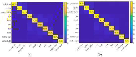 From Figure 11, we can see that the main error happened when road traffic participants were classified as other types of road traffic participants (i.e., “pedestrian”, “cyclist”, and “motorcyclist”) and when vehicles were classified as other types of vehicles (i.e., “car”, “truck”, “van”, “bus”, and “train”). The reason for this could be that these road traffic participants are very similar in appearance in the current dataset and their backgrounds are also very similar. The misclassification of vehicles may be due to similar reasons. In addition, the precision of classification prediction of the dual-modal network using the middle-stage fusion strategy (MSFS) II with weight assignment (WA)-based method was higher than that of the single-modal network-based method. This shows that increasing the feature information by using LIDAR images is conducive to better classification of traffic targets.