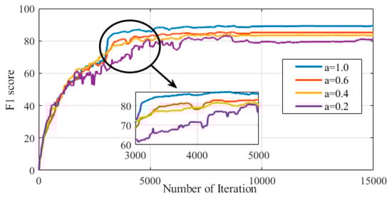 The weight assignment function includes a key parameter, the feature impact factor a, which represents the dependence of our model on different FPN layers. The higher the value of the parameter, the less we rely on the low-level pyramid feature layers, which means that we prefer to use the high-level semantic information of LIDAR images to classify the target. In this paper, the influence of the feature impact factor a was tested by setting its value to 1.0, 0.6, 0.4, or 0.2. The training results are shown in Figure 12.