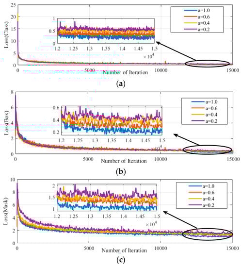 Loss curves using different values of the feature impact factor: (a) classification loss; (b) b-box regression loss; and (c) mask loss.