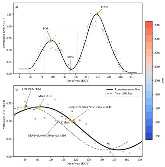 Schematic demonstration of extracting annual phenological metrics based on multi-year Landsat images. (a) Solid line indicates the multi-year mean fitted line using cubic spline smoothing method. POS1 represents the peak of season of the first cropping cycle, SOS2 indicates the start of season of the second cropping cycles, and POS2 is the peak of season of the second cropping cycle. Colored points stand for normalized enhanced vegetation index (NEVI) in different years. POS1 and POS2 are defined as the first and second peak of the two cropping cycles, respectively. SOS2 is defined as the trough between the two neighboring peaks. Dashed box in panel (a) shows the boundary of the zoom-in plot of panel (b); (b) Solid line is a zoom-in version of the dashed box in panel (a). Dashed line is the fitted phenological curve in year 1996 by shifting multi-year fitted line to the left by 11 days. Eleven days were calculated as the deviation between the acquisition DOY in year 1996 and the DOY of fitted NEVI time series which corresponds to the same NEVI value in year 1996. We did not calculate the mean value of deviation, because there is only one qualified DOY in the year 1996. The POS1 in year 1996 is then calculated by deducting 11 days from the long-term mean POS1.