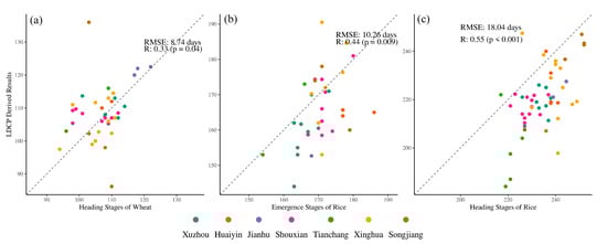 Validation of LDCP-derived phenological metrics (POS1 for (a), SOS2 for (b), POS2 for (c)) in relation to the in situ phenological stages. Dashed black line is the 1:1 line. Colored points represent results at 7 ground cropland phenology stations. RMSE stands for root mean square error. R represents the correlation between crop stages on the ground and predicted phenological metrics from remote sensing.