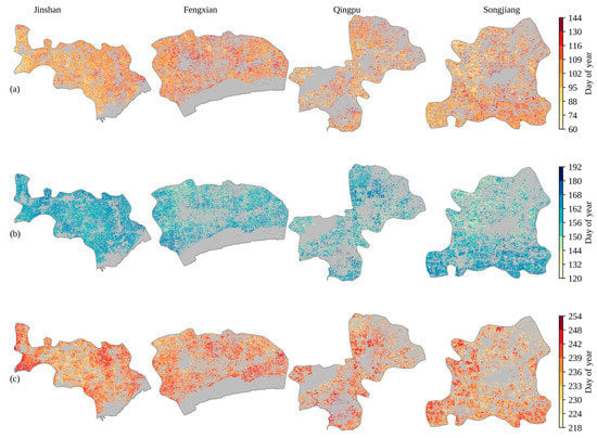 Maps of long-term mean phenological metrics in the four counties of Shanghai. Each column in the figure indicates one of the four counties. (a) maps of peak of first cropping cycle (POS1). (b) maps of start of second cropping cycle (SOS2). (c) maps of peak of second cropping cycle (POS2). Gray regions represent missing data and non-crop areas.