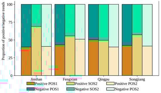 Interannual variations of cropland phenology can improve the understanding of the impacts of climate change on crop growth and phenological development. The interannual trends of the phenological metrics from 1993 to 2009 over the four districts are shown in Figure 5. We excluded pixels with less than five years of data in the time series and only plotted the pixels that exhibited a significant trend (p-value < 0.05). Similar to Figure 4, we can observe a spatially heterogeneous temporal trend for each of the three phenological metrics in four districts of Shanghai at Landsat spatial resolution. Two neighboring parcels can exhibit the opposite trend, and the long-term trends of phenological metrics showed a great variation across the four districts. The proportion of significant positive and negative trends for each district were summarized in Figure 6. For POS1, the percentage of significant negative trends was 59.9%, 56.9%, 57.7% in the district of Jinshan, Fengxian, and Songjiang, respectively, indicating that the timing of POS1 was increasingly significantly earlier in most of the regions. Meanwhile, for the Qingpu district, approximately half of the regions had an advanced POS1, while the other half exhibited a delayed POS1. As for SOS2, 68.9%, 55.6%, and 57.2% of the pixels were significantly delayed in the district of Jinshan, Fengxian, and Songjiang, respectively. An earlier POS1 and a later SOS2, mostly in Jinshan, Fengxian, and Songjiang, could indicate a longer growing season for the first crop. Trends of SOS2 in Qingpu district were non-uniform, with approximately half of the regions observed to have an earlier SOS2. As for POS2, Fengxian had a mixed temporal pattern, with 51% of the regions exhibiting earlier POS2. The other three districts, Jinshan, Qingpu, and Songjiang, had advanced POS2 in 59.2%, 60%, and 58.6% of the cropland areas, respectively. Two major factors may explain the temporal trends. First, changes in climatic factors (temperature and precipitation) were reported to influence cropland phenology in China based on ground observations [37,38,39]. Warming temperature in the winter was found to provide favorable growth conditions for cropland (potential driving forces of earlier POS1 and POS2). At the same time, precipitation plays a less important role, because irrigation can greatly increase the soil moisture in the cropland [40]. However, it is challenging to isolate the effects of climate change on Landsat-derived cropland phenology due to the lack of 30-m spatial resolution climate data. The discrepancies in POS1/SOS2 trends between Qingpu and the other three districts could be attributed to the water coverage differences. There were generally more rivers and lakes in Qingpu (Figure 1) than the other three districts, potentially changing the local fluxes of heat and moisture through mesoscale circulation [41] and thus influencing crop growth. For example, studies found that lakes and rivers could reduce the land surface temperature from 2.4–3.3 °C in rural areas, and the maximum cooling distance could reach 440 m and 532 m in spring and summer, respectively [42], which may delay POS1. The second potential factor might be agricultural practice. Studies have documented that crop rotation, irrigation, fertilization, and the introduction of new cultivars can significantly alter the interannual variation of cropland phenology [43,44,45]. The urbanization process in suburban regions of Shanghai might introduce more non-agricultural activities and reduce farm labor availability (i.e., cropland abandonment) [46], thus impacting the agricultural practice and affecting the cropland phenology. For example, SOS2 was mainly determined by the agricultural practice because SOS2 represents the harvesting date of first season crops and the planting date of the second season crops. The harvesting and planting generally required large input of labor in China. The reduced availabilities of farming labors due to urbanization might delay SOS2 in our study sites.