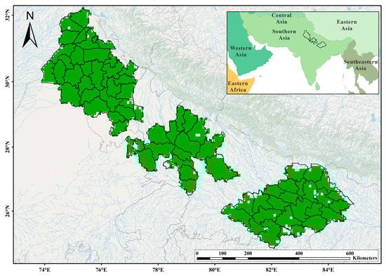The study area was located in the Indo-Gangetic Plains (IGP), a major wheat-producing region in Northwest India, with abundant irrigation and fertilizer (Figure 1). In the IGP, winter wheat is usually planted from November to December and harvested during May of the following year. The variations in planting and harvest dates across this region are around 20 days, and heat stress mainly occurs during the grain-filling stage of wheat [4]. We conducted this study focusing on March and April, to ensure all districts were at the grain-filling stage and all data we used in this study could be well-matched in temporal resolution (i.e., monthly). The wheat harvested area with 0.083° spatial resolution was identified via http://www.sage.wisc.edu [30,31].