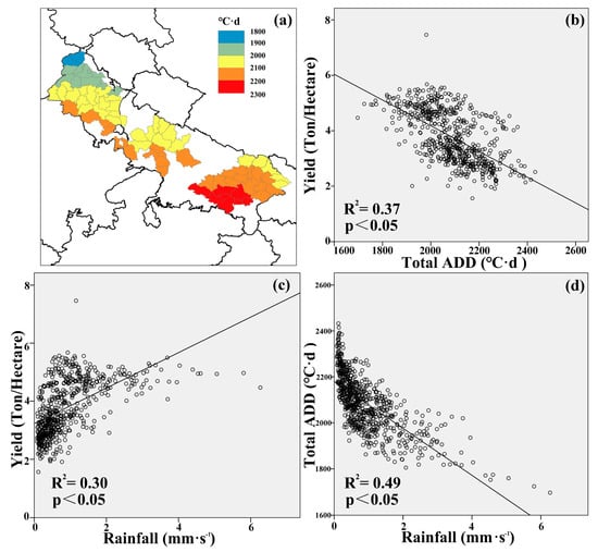 The spatial map of the total accumulated degree days (ADD) during the wheat grain-filling stage across the IGP (a), and the relationships between (b) the total ADD and yield, (c) rainfall and yield, and (d) rainfall and the total ADD at the district scale.