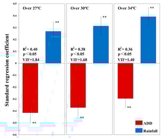 where t represents the daily time step, N is the total number of days in the month, DD represents degree days, and are the different lower and upper limit temperatures, respectively, in different accumulated temperature ranges. In this study, was set to 0 °C, 27 °C, 30 °C, and 34 °C, was set to 27 °C, 30 °C, 34 °C, and ∞. We computed the ADD over 0 °C, 27 °C, 30 °C, and 34 °C ( = 0 °C, 27 °C, 30 °C, and 34 °C), and termed them ADD>0°C, ADD>27°C, ADD>30°C, and ADD>34°C, respectively. It was noted that all daily maximum temperatures in March–April were not below 0 °C, across our study area, and therefore, ADD>0°C was also defined as the total ADD. The different ADDs (i.e., ADD>0°C, ADD>27°C, ADD>30°C, and ADD>34°C) represent different levels of heat stress.