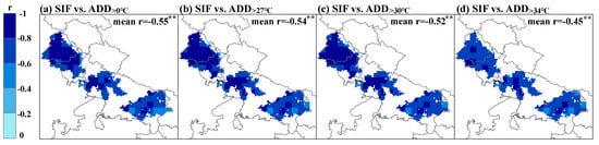 Pearson correlation coefficients (r) between the mean solar-induced chlorophyll fluorescence (SIF) and ADD over (a) 0 °C, (b) 27 °C, (c) 30 °C, and (d) 34 °C in March–April. Colored pixels are statistically significant (p < 0.05). The mean r is the average of the correlation coefficients at the district scale and stars indicate statistical significance (**: p < 0.05).