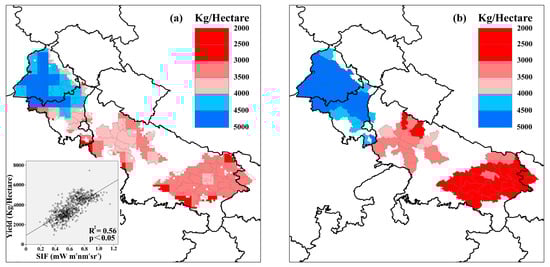 Spatial distributions of winter wheat yield based on (a) SIF and (b) district-level statistical reports. The scatter plots in the bottom-left corner show the relationship between the yield and SIF at the district scale, each dot represents the mean SIF in March–April and statistical yield, for each district and one year.