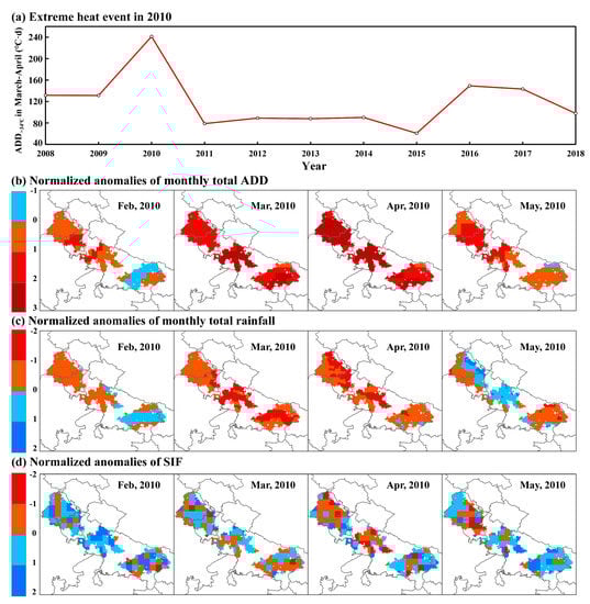 where is the intercept, , , and is the regression coefficients, and is the residual. The normalized anomalies of variables were calculated on a pixel-by-pixel basis to compare the spatial–temporal variations in ADDs, rainfall, and SIF: