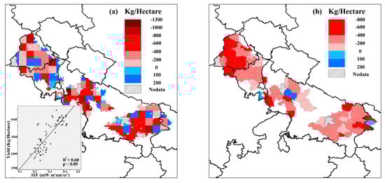 Spatial distributions of 2010 winter wheat yield loss based on (a) SIF and (b) district-level statistical reports. The scatter plots in the bottom-left corner show the linear regression model that describes the relationship between the yield and SIF, each dot represents the mean SIF in March–April and statistical yield for each district in 2010.