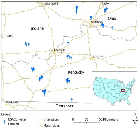 Study area: blue pins are the water samples collected by the USACE Louisville District Water Quality Team from May 2013 to November 2017.
