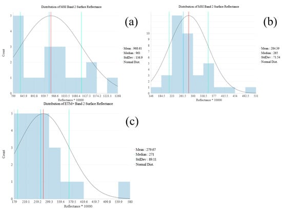 Frequency distributions of surface reflectance over water quality samples from (a) Sentinel-2 MSI, (b) Landsat 8 OLI, and (c) Landsat 7 ETM+.