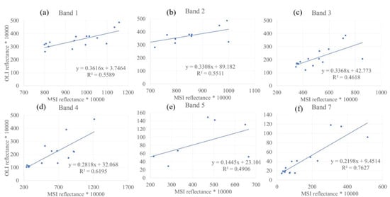 Band calibration between Sentinel-2 MSI (x-axis) and Landsat 8 OLI (y-axis) surface reflectance: (a) Band 1; (b) Band 2; (c) Band 3; (d) Band 4; (e) Band 5; (f) Band 7. (Note: the x axis and the y axis of the charts mark the reflectance values multiplied by 10,000). For consistency, the band names refer to the Thematic Mapper bands.