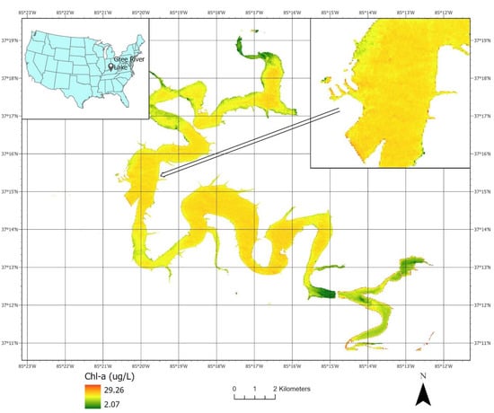 The SVM model was trained using the sample data to predict Chl-a concentration in the study area with the images obtained from the GEE image repositories. One of the unsampled lakes, Green River Lake in Kentucky, is displayed in Figure 5 to show the predicted Chl-a concentration from a Sentinel-2A image acquired on 28 August 2016. The map shows a spatially coherent distribution of Chl-a concentration in the lake. Such spatial coherence is expected and follows the First Law of Geography [] regarding the quality of spatial data.