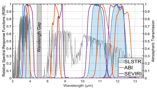 The ability to retrieve the SSTskin by making atmospheric corrections is based on different atmospheric transmissions at different infrared wavelengths. The measurements are usually taken in spectral regions with wavelengths from ~3.5 μm to ~4.1 μm and ~10 μm to ~13 μm, where the atmosphere is quite transparent, with variations in clear-sky transmission caused primarily by water vapor, which in itself is highly variable. The widely used SSTskin retrieval algorithm, the non-linear SST (NLSST; [27]), is based on the atmospheric transmission window near the IR112 and IR123 bands (Table 1), with other dependences on satellite zenith angle, first-guess SST, coefficient set for latitude bands and month of year [2,28]. The IR038 band near the 3.7–3.9 μm interval can be used to retrieve nighttime SSTskin and correct dust aerosol effect [29,30,31]. Both ABI and SEVIRI are spectrally matched to three SLSTR bands, S7, S8, and S9, respectively. Additionally, ABI and SEVIRI have an IR086 band near 8.5–8.7 μm for deriving SSTskin. However, the SLSTR does not include a similar IR086 band in their SSTskin retrievals. For this reason, we only consider comparisons of the bands near the SLSTR S7 (λ = 3.74 μm), S8 (λ = 10.95 μm), and S9 (λ = 12.00 μm) spectral ranges in this study.