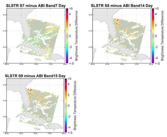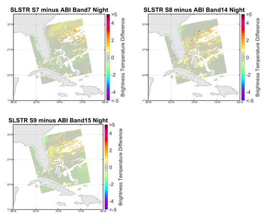 The variabilities of the oceanographic and atmospheric conditions along the Gulf Stream have drawn a lot of attention for many years. The Florida Current causes complex SST variations as well as a strong atmospheric response in this region [42]. Inter-comparison of Sentinel-3A SLSTR and GOES-16 ABI in this region supports the regional studies of the Gulf Stream and Florida Current.