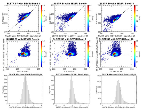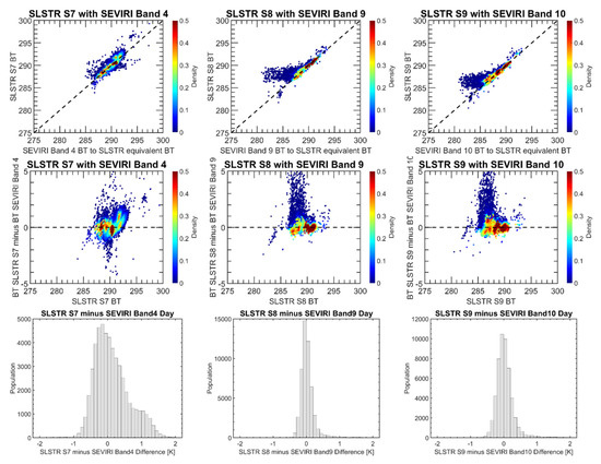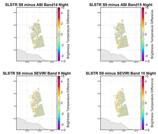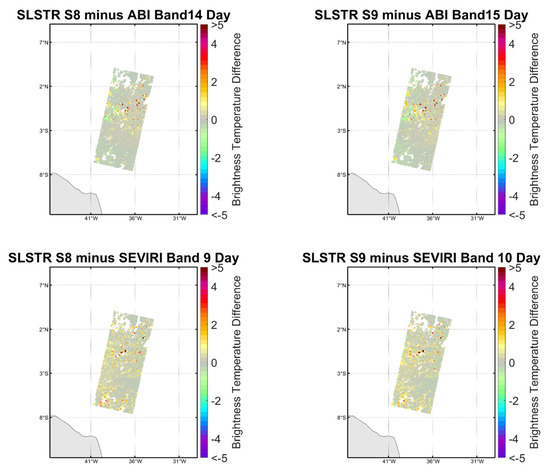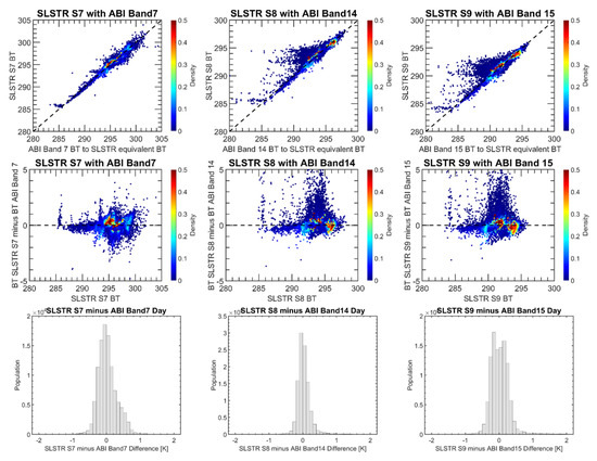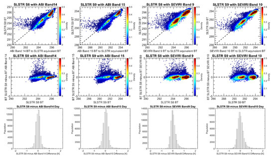 Table 6 shows the statistics of the SLSTR BTs minus ABI/SEVIRI equivalent BTs. The average BT differences are on the order of 0.1 K. Daytime comparisons are better than at nighttime in terms of the average difference and standard deviations. The standard deviations of SLSTR vs ABI are higher than SLSTR vs SEVIRI. The SLSTR S9 band comparisons have larger differences than the S8 band comparisons.