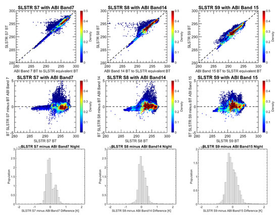 From the geographical distribution of BT differences corresponding to the matching and selection criteria (Figure 7), there is an overall positive bias when comparing the matched SLSTR and equivalent ABI BTs. The dashed lines in the panels in the first row of Figure 8 represent the one-to-one relationship, showing that for SLSTR bands S8 and S9, the BTs < 290 K deviate from the one-to-one lines. These results are consistent with other SLSTR BT comparisons, such as by Shrestha, et al. [43] who also found such discrepancies at the lower SLSTR BTs when compared with those of MODIS. Here, this result may come from the residual contamination at cloud edges and by thin ice clouds, since their BTs are normally lower than those of the sea surface. Although no matchup pairs used to derive the ABI to SLSTR transfer functions are selected with the satellite zenith angle > 45° in this study, the difference distributions based on the selected granule show discrepancies with large viewing angles in S8 and S9 spectral channels. Figure 8 (third row) illustrates the histograms of the BT difference of SLSTR minus ABI during nighttime, which indicates the close similarity of the skewed distributions. Table 4 summarizes the statistics of the SLSTR BTs minus ABI equivalent BTs in this region, the averaged BT differences are on the order of −0.035 K to 0.079 K with the S7 band comparisons having the minimum average difference.