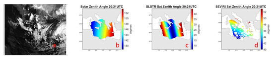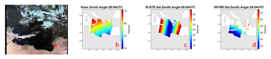 As the largest semi-enclosed sea in the world, the Mediterranean Sea has highly specific oceanic characteristics. The SST diurnal cycles in the Mediterranean Sea are more frequent than global regions [44], which can cause marked SST changes. Several studies have estimated the heat budget and their relations to the SST diurnal cycle [45,46]. Satellite measurements can provide high-quality synoptic datasets to study the Mediterranean Sea heat budget, accurate knowledge of their performance is crucial for such research. Figure 9a gives the daytime false color infrared image and satellite geometry data on 23 December 2019, 09:04:56 UTC—the reason for choosing this time is that there is less cloud cover compared to other days.