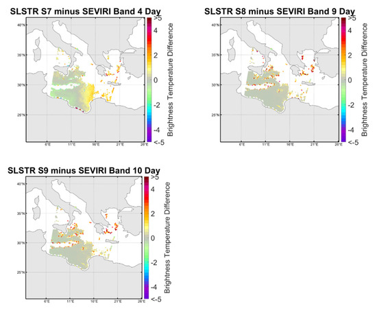 Distributions of the daytime BT differences between SLSTR and SEVIRI in the Mediterranean Sea region of SLSTR S7 (top-left), S8 (top-right) and S9 (bottom-left). The colors indicate the SLSTR minus SEVIRI equivalent BTs.
