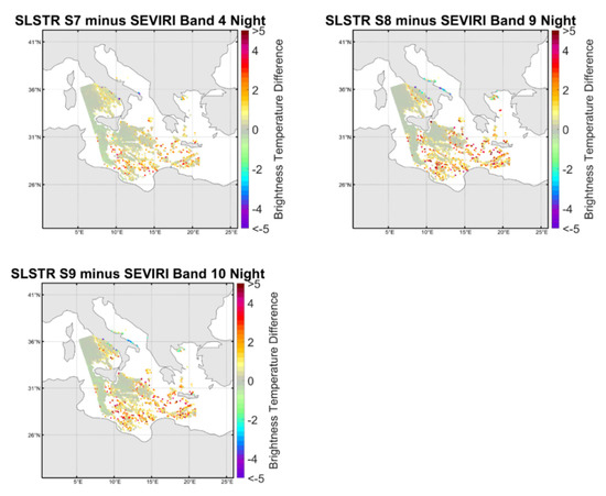 Among the SLSTR nine spectral channels in the 0.554–12.022 μm wavelength spectral range, bands S7 (3.74 μm), S8 (10.95 μm), and S9 (12.00 μm) are used for deriving the SSTskin. Here, we compared the BTs of these three SLSTR thermal emission bands with those from geostationary satellite radiometers.