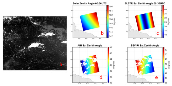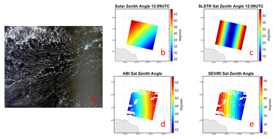 (a): SLSTR daytime false color infrared image of the cross-covered region on 27 November 2019, 12:09 UTC. (b): Solar zenith angles data at the same time. Corresponding SLSTR (c), ABI (d), SEVIRI (e) satellite zenith angles data.