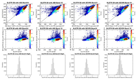 Sensor-to-sensor comparison can be used to provide assessment on many newly launched sensors. The previous solar reflective band comparisons between the Advanced Himawari Imager (AHI; [12]) and the Visible Infrared Imaging Radiometer Suite (VIIRS; [13]) by Yu and Wu [14] confirmed the linear relationships between them using collocated pairs. The collocated deep convective cloud data have a small difference in the near-infrared bands. Liang, et al. [15] compared measurements and simulations of the AHI, VIIRS and MODerate-resolution Imaging Spectroradiometers (MODIS; [16]) for clear-sky radiances above the sea surface and found the biases in the sensor radiances minus model simulated radiances are relatively stable. Li, et al. [17] have reported a comparison of measurements of MODIS and VIIRS thermal emissive bands using Atmospheric Infrared Sounder (AIRS) hyperspectral radiances convolved with the relative spectral response functions of the MODIS and VIIRS bands, they found the BTs agree relatively well with each other, the differences being within 0.2K. Many other investigators also use this approach to conduct comparisons between various sensors [17,18,19]. We use conversion functions derived by radiative transfer model simulations to convert the BTs retrieved by geostationary satellite radiometers into SLSTR equivalent versions to perform the analysis reported here. This method has been used by Yu and Wu [14], NASA Langley spectral band difference adjustment [20] and Wu, et al. [21] and others, and found to be useful.