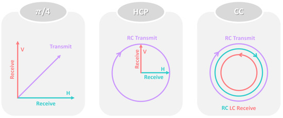 Single and conventional DP SAR sensors that transmit only one polarized signal per along-track sample are able to collect data in a larger swath width with lower polarimetric information content compared to FP SAR sensors. Compact polarimetry (CP) SAR systems can collect polarimetric information comparable to that of quad-pol SAR, while addressing the technical limitations inherent to quad-pol SAR [29,30]. Specifically, all CP modes (i.e., π/4, CC, HCP), demonstrated in Figure 1, transmit one polarization and receive two polarizations, much like dual-pol SAR sensors [31]. In π/4 compact polarimetry mode, a linearly polarized signal at 45° is transmitted and two orthogonal linear polarizations are received (i.e., H and V; see Figure 1). To generate a linearly polarized signal at π/4, the radar transmits H and V with the same amplitudes simultaneously with zero relative phase. The creators of the RCM polarimetric modes had as their objective to retain the advantages of a DP radar while incorporating the added advantages of an FP SAR. Their response? Transmit H and V polarizations simultaneously, but in a way that allowed their individual contributions to be available after reception for polarimetric analysis. Transmission of circular polarization and reception on two orthogonal polarizations is known as HCP. Specifically, compact polarimetric SAR sensors (i.e., circularly transmit and circularly receive (CC) and HCP) transmit one circular polarization and receive two orthogonally polarized channels, much like DP SAR sensors. However, compact polarimetric SAR data retains the relative phase of the receiving polarizations unlike conventional DP SAR systems. In order to transmit circular polarization, the radar transmits H and V simultaneously with a 90° phase difference. In HCP and CC compact polarimetry modes, circularly polarized signal is transmitted and two orthogonal linearly and circularly polarized signals are received, respectively. Accordingly, both HCP and CC systems transmit a circular polarization and have the same Stokes parameters, as these parameters are independent of the receiver’s polarization basis [32] and thus, a circular receiver, which complicates sensor implementation, is not needed. Therefore, an HCP polarization mode is an optimum configuration to be considered for the current and next generation of SAR satellites. All operational polarimetric modes aboard RCM are HCP. It turns out that the reception polarizations do not matter from a user’s point of view, leaving that choice to the radar hardware team to choose the polarization that best meets their technical and budgetary requirements.