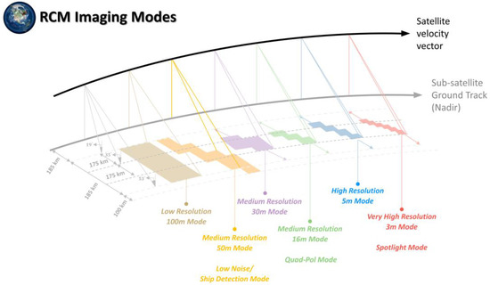 RCM fills the need for an operational medium resolution EO system, for monitoring wide geographic regions of Canada’ land mass and its surrounding waters. The medium-resolution data (30 to 100 m) with large swath widths are also used for maritime surveillance and environmental applications. Higher resolution images are collected for selected site-specific applications to monitor and manage natural resources and for environmental protection. High-resolution modes at 1-, 3-, and 5-m resolutions are designed to meet the needs for disaster management, as part of Canada’s contribution to international agreements. As such, the availability of HCP data collected by RCM is of great importance and can be consider as one of the main sources of information for Government of Canada managers and decision makers. Figure 2 illustrates the imaging RCM modes ranging from low/medium-resolution (100 m) to very high-resolution Spotlight mode (1 m × 3 m). All of RCM’s operational modes are single, dual, or compact polarimetric. An FP mode is included to provide support for calibration, to demonstrate FP vs. HCP polarimetric equivalence, and to support the background theme of the RADARSAT continuity.