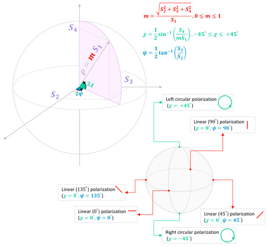 The geometrical relationship between Stokes and Poincaré parameters is portrayed in Figure 3. In this figure, denote Stokes parameters in a rectangular coordinate system. The Poincaré sphere, which is devoted exclusively to the polarimetric constituents, locates the same point on the surface of the sphere by two angular variables, and , in a spherical coordinate system. The Poincaré sphere’s radius often is portrayed as unity, the normalized situation. In practice, it is helpful to explicitly include the radius , where m is the degree of polarization. The product of m and the first Stokes parameter represents the intensity of the polarized portion of the backscattered wave. Each point on the surface of the Poincaré sphere represents a unique polarization stipulated by the four Stokes parameters.