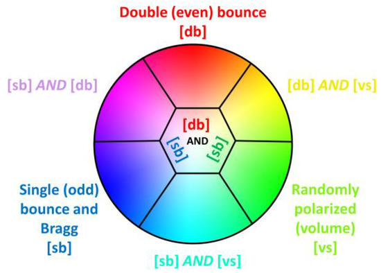 The classification of HCP data is developed based on the 2 × 2 covariance (or coherency) matrix [57], Stokes vector parameters, and different HCP decomposition methods, such as [34,58]. For instance, Kumar et al. [48] compared the results of three unsupervised classifications methods, namely , , , using RISAT-1 HCP SAR data for crop classification. They reported that an improvement in classification result was observed by applying compared to the other two classifications [59]. Figure 4 demonstrates seven-fold unsupervised classification using a red, green, blue (RGB) color wheel.