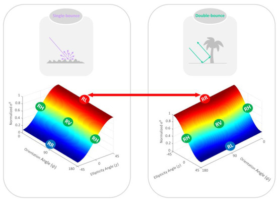 As seen, in some conditions, and have approximately the same values in response to odd-bounce and even-bounce backscattering. Thus, they have a poor discrimination capability; however, and demonstrate a completely different response between odd-bounce and even-bounce backscattering. In particular, odd-bounce scattering produces a strong opposite-sense reflection (RL), and even-bounce produces a strong same-sense reflection (RR). Therefore, and are advantageous for distinguishing odd-bounce from even-bounce scattering compared to and .