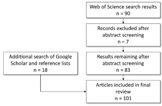 To provide a thorough review of the existing literature relating to compact polarimetry, a search of Thomson Reuters Web of Science for related English language articles, review papers, letters, and conference papers was conducted. Preferred Reporting Items for Systematic Reviews and Meta-Analyses (PRISMA) were then applied for study selection [64] using the following basic query: (“Simulated Compact Polarimetry” OR “Compact Polarimetry” OR “RADARSAT Constellation Mission” OR “RCM” OR “RISAT-1”) AND (“remote sensing” OR “Earth Observation” OR “SAR” OR “Synthetic Aperture Radar”). The search returned a total of 90 results, dating between the years of 2005 and 2020. Of the results, 56 were journal articles, 33 were conference papers, 2 were letters, and 1 was a correction. All resulting articles but the corrections were downloaded and reviewed further to ensure relevance. Abstracts were reviewed for relevant topics, such as discussions and analysis of specific applications of compact polarimetry, and the development and introduction of new techniques, such as those relating to decomposition. After this review, a total of 83 papers remained from the initial 90 search results. Following the queried search of Web of Science, additional searches for relevant articles were conducted using Google Search Engine, Google Scholar, and some review of the references cited in the 83 resulting papers. Ultimately, a total of 101 papers were gathered, reviewed, and summarized in this systematic review and meta-analysis. A summary of the article selection process can be seen in Figure 6. Note that while best efforts were made to review all relevant articles, some articles may not have been captured during the literature search.