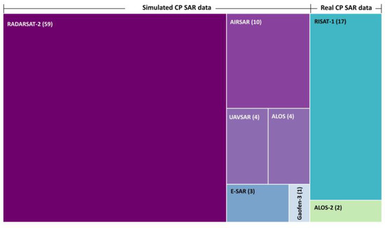 Among these studies, a total of 19 studies used real CP data, 17 of which used RISAT-1 data, by far the most common data source for real compact polarimetry data, and two which used ALOS-2 (Figure 9). However, a majority of the studies, 82 in total, used simulated CP data from a number of different satellites. RADARSAT-2 is the most common source for simulated compact polarimetry data, being used in 59 studies. Other sources of simulated compact polarimetry data include AIRSAR (10 studies), ALOS (4 studies; ALOS-1 & -2), UAVSAR (4 studies), and E-SAR (3 studies each). Data from Gaofen-3 are used in only a single study.