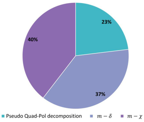 Figure 10 visualizes the use of various decomposition methods in the reviewed studies. Of the total studies, 40% employ the use of the decomposition, followed closely by the decomposition at 37%. In addition, 23% of the studies, almost half of those that used apply the use of Pseudo FP SAR data, despite this practice being advised against. Note that the purpose of a very small number of studies was to derive and apply modified decomposition techniques, the majority of which were applying a modified decomposition.